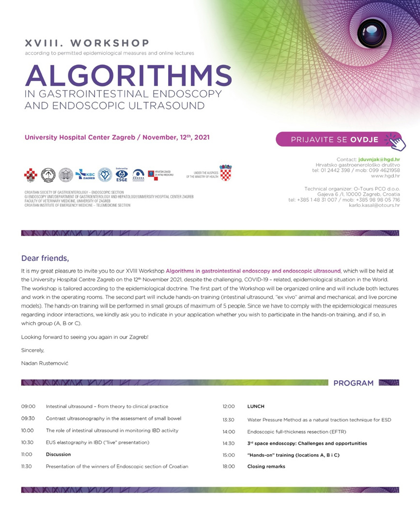 XVIII. WORKSHOP ALGORITHMS in gastrointestinal endoscopy and endoscopic ultrasound, radionica je održana u KBC-u Zagreb, 12.11.2021. te je obuhvatila razmjenu stručnih teorijskih znanja ali i praktičan dio, hands-on training koji je bio održan u malim grupama sa različitm tematikama.